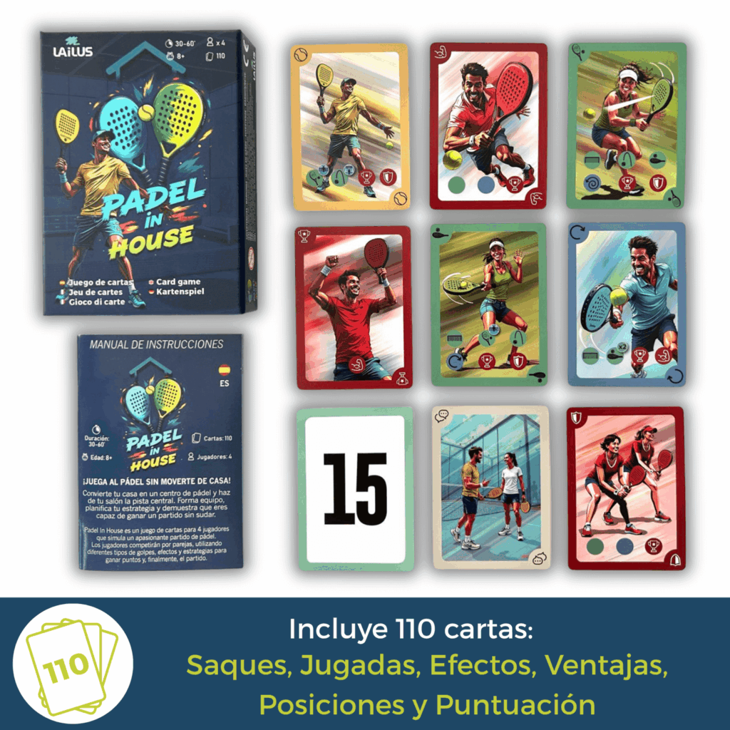 Padel in House es el juego de cartas de padel que transforma cualquier mesa en una pista. Con más de 100 cartas y reglas fáciles, recrea la emoción de un partido real: saques, voleas, globos, dejadas, remates y mucha estrategia.